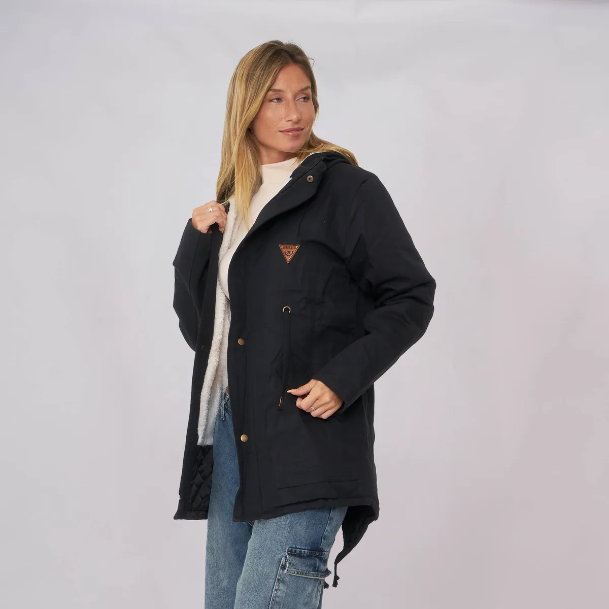 Nuestra PARKA PRAGA, esta confeccionada en gabardina verde/negro por fuera y en corderito sintético blanco por dentro, y viene con capucha. Trae tiras ajustables a la altura de la cintura, para hacerla más o menos entallada y su esplada cuenta con una terminación cola tiburon. En sus laterales inferiores trae bolsillos y un parche para poder customizarla!